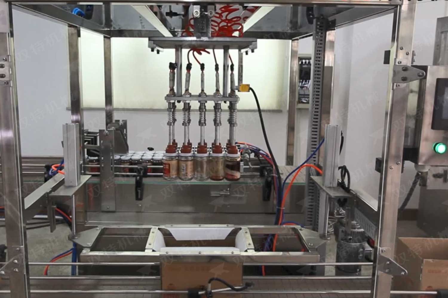 旋蓋機(jī)主要用于玻璃廣口瓶的三、四、六鐵蓋真空旋蓋,用兩根不同速度的皮帶壓瓶蓋,因兩根皮帶的速度不同,對蓋進(jìn)行搓蓋收緊達(dá)到旋蓋目的。在自動上蓋之前對瓶口吹蒸汽加熱,吹掉冷空氣,換上高溫蒸汽,立即旋蓋,根據(jù)熱脹冷縮原理,蒸汽冷下來就自然形成了瓶內(nèi)真空,達(dá)到了真空旋蓋的目的。自動旋蓋機(jī)可以和濃醬灌裝機(jī)、蜂蜜灌裝機(jī)、辣椒醬灌裝機(jī)組合在一起,形成一套全自動灌裝設(shè)備,是現(xiàn)代調(diào)味品企業(yè)的得力幫手。
